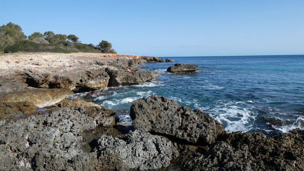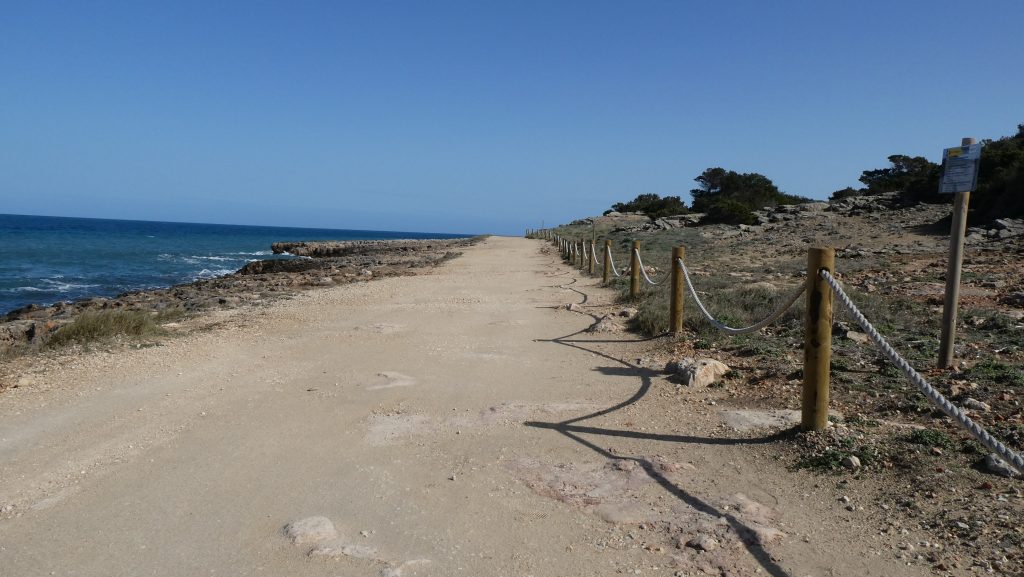 Nachdem wir dem Verlauf der Meereslinie über etwa 680 Meter nach Süden gefolgt sind, endet die ausgebaute Strandpromenade zwar an der carrer (Straße) de Golf, doch können wir in südöstlicher Richtung den platja de sa Cala Nau betreten. Über den Sandstrand erreichen wir nach etwa 60 Meter einen schmalen felsigen Landstreifen, der nach Nordosten vom Meer und nach Südwesten vom Wald begrenzt wird. Über die Steine und Felsen gehen wir weiter in südöstlicher Richtung bis sich uns nach etwa 190 Meter durch mehrere Pfade die Möglichkeit eröffnet, nach Süden einzuschwenken und nach weiteren etwa 35 Meter auf einen unbefestigten Weg zu gelangen, der über die westlich gelegene carrer de Castell auch für Fahrzeuge zugänglich ist.