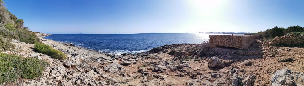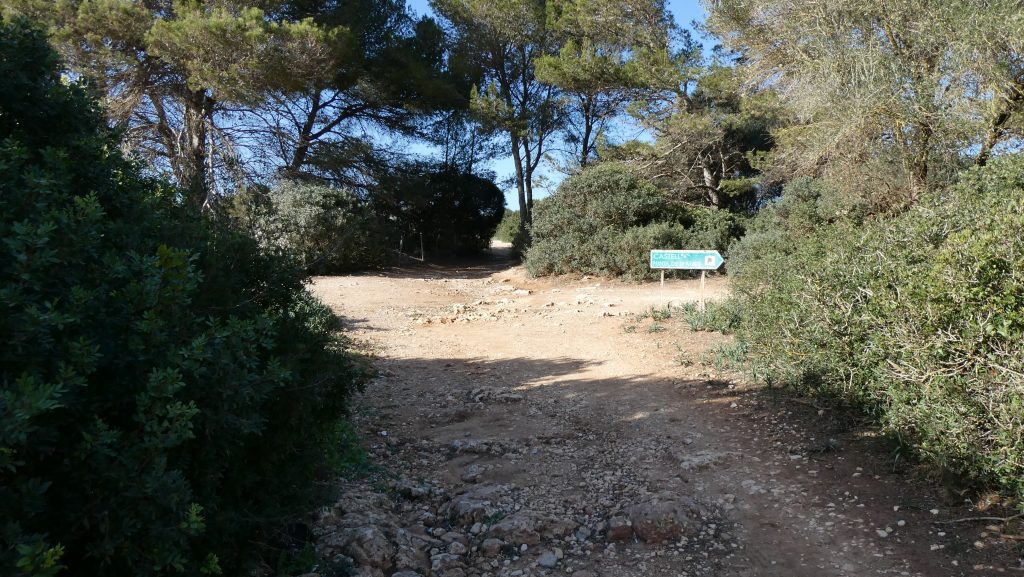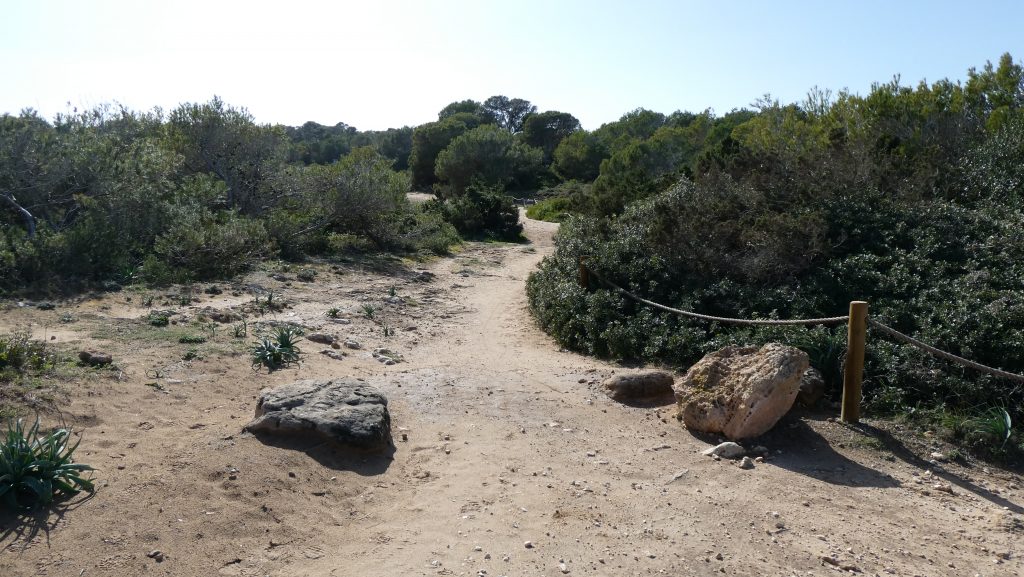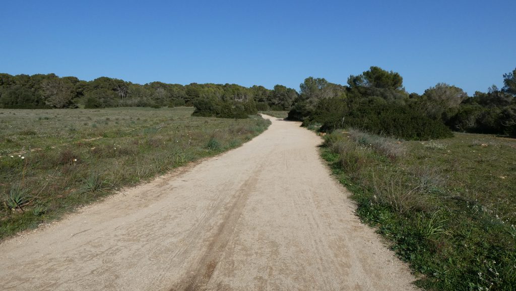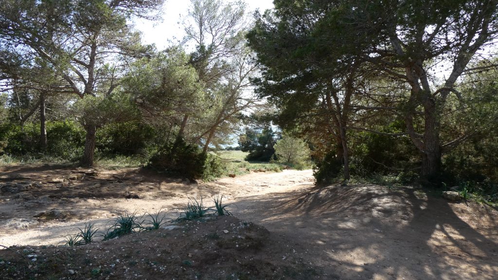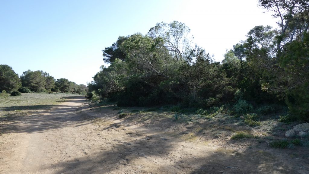 Dem nach Osten verlaufenden Weg gehen wir über etwa 170 Meter durch einen aus Aleppo-Kiefern bestehenden Wald nach. Nachdem wir auf eine nahezu allein von Gräsern bedeckte Freifläche getroffen sind, folgen wir dem Weg über etwa 390 Meter weiter in nordöstlicher Richtung, zunächst mitten über die Grasfläche und sodann entlang der im Südosten stehenden Aleppo-Kiefern. Der Weg, der im weiteren Verlauf über etwa 50 Meter an beiden Seiten von Aleppo-Kiefern gesäumt wird, führt zu einer weiteren nahezu nur mit Gräsern bewachsenen Freifläche, die sich uns in südlicher Richtung eröffnet und nach Norden von Aleppo-Kiefern begrenzt wird. Der nach Osten verlaufende Weg schwenkt nach etwa 190 Meter in nördliche Richtung und nach weiteren etwa 100 Meter wieder nach Osten. Wir befinden uns an einer uns bereits bekannten Stelle, an der wir den Weg bereits einmal von Norden nach Süden überquert hatten. Durch die beidseitig gelegene Garrigue folgen wir dem Weg weiter in zunächst östlicher und sodann nordöstlicher Richtung, sodass wir nach etwa 520 Meter an das castell (Kastell) de sa Punta de n’Amer gelangen.