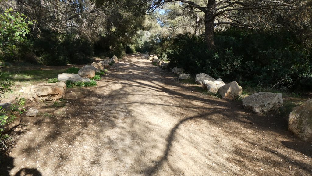 Wir wenden uns auf dem Weg zwar zunächst in südwestliche Richtung, verlassen ihn sodann aber wieder, nachdem wir nach etwa 25 Meter wieder eine nahezu allein von Gräsern bedeckte Freifläche erreichen, die im Westen durch den am Waldrand verlaufenden Weg und im Osten durch einen Saum von Aleppo-Kiefern begrenzt wird. Nachdem wir den nach Süden verlaufenden Pfad betreten haben, gehen wir über etwa 245 Meter entlang des Saums der Aleppo-Kiefern bis zu der Biegung, an der der Trail in westliche Richtung schwenkt.