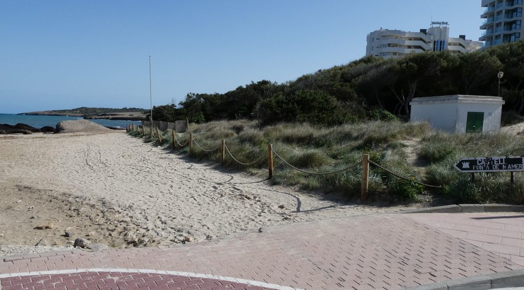 Vom castell de sa Punta de n’Amer nehmen wir den nach Nordwesten führenden Weg, der uns über etwa 1,1 Kilometer zunächst durch die auf beiden Seiten gelegene Garrigue, sodann über eine nahezu allein von Gräsern bedeckte Freifläche und schließlich entlang der Küstenlinie in Richtung des platja de sa Cala Nau führt. Nachdem wir die etwa 225 Meter über den steinigen und felsigen Landstreifen zwischen dem Weg und dem platja de sa Cala Nau überwunden haben, gelangen wir auf den Sandstrand, der uns nach etwa 60 Meter auf die ausgebaute Strandpromenade leitet. Entlang des platja de sa Cala Nau und des platja de Sant Llorenç gehen wir in nördlicher Richtung und erreichen nach etwa 680 Meter den parc de sa Mar.