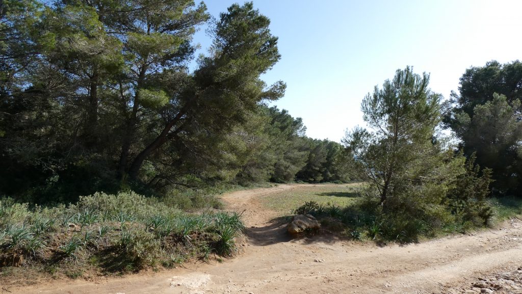 Der Trail führt uns auf eine nahezu nur mit Gräsern bewachsene Freifläche, die im Westen von einem aus Aleppo-Kiefern bestehenden Wald und im Osten von Garrigue begrenzt wird. Zunächst gehen wir mitten über die Grasfläche, bevor der Pfad nach etwa 275 Meter an den Waldrand stößt und in südliche Richtung schwenkt. Mit den Aleppo-Kiefern an unserer rechten Seite folgen wir dem Trail über etwa 435 Meter bis wir an einen unbefestigten Weg gelangen, an dem auch die Grasfläche ihre Begrenzung findet.
